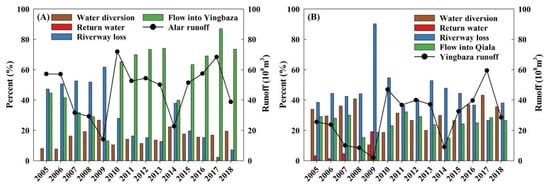 Water regime change and water volume conversion in different river sections from 2005 to 2017. (A) Alar-Yingbaza, (B) Yingbaza-Qiala.