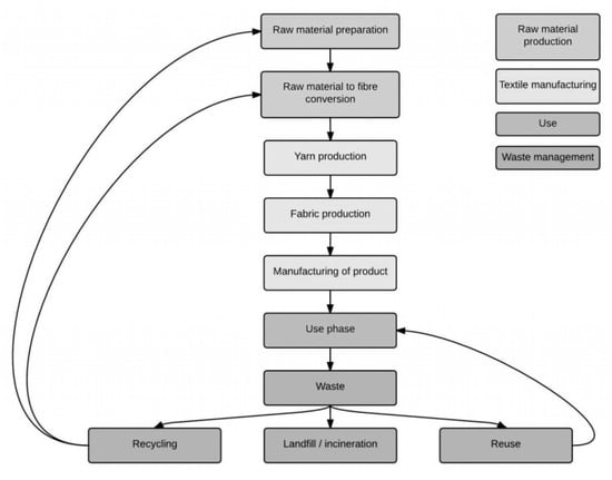 All stages (Figure 1) in the life cycle of a garment have a sustainability impact. The industry employs approximately 26.5 million people globally, with women representing about 70% of the industrial workers [,], and it is specifically known for occurrences of hazardous working conditions and violations of human rights. Social issues are thus specifically relevant to SDG 5 “Gender Equality” and SDG 8 “Decent Work”.