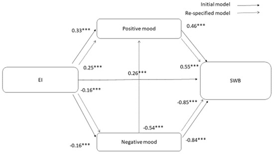 In the re-specified model of parents in the total sample, direct and indirect effects were statistically significant. There were direct effects of EI on negative mood (Coeff = −0.16, SE = 0.05, p-value = 0.003), EI on positive mood (Coeff = 0.25, SE = 0.05, p-value = 0.001), and negative on positive mood (Coeff = −0.54, SE = 0.06, p-value = 0.001). Moreover, the direct effects of positive mood (Coeff = 0.55, SE = 0.07, p-value = 0.001) and negative mood (Coeff = −0.85, SE = 0.08, p-value = 0.001) were also statistically significant. The indirect effects were all statistically significant, including EI on SWB through negative mood (Coeff = 0.32, p-value = 0.003, 95% BC confidence interval = 0.20 to 0.49) and positive mood (Coeff = 0.08, p-value = 0.001, 95% BC confidence interval = 0.03 to 0.15) and negative mood on SWB through positive mood (Coeff = −0.30, p-value = 0.001, 95% BC confidence interval = −0.43 to −0.20). The confidence intervals of all variables did not include 0; thus, the mediation effects were statistically significant.