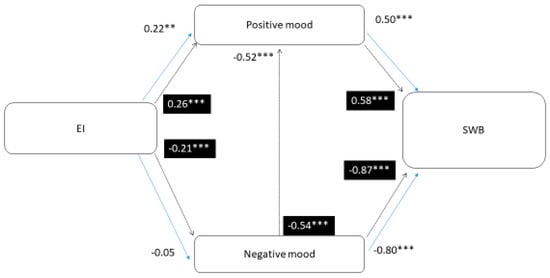 A positive impact of EI on stress control has been documented [88], and EI is a predictor of SWB in adults [81]. This finding is the fundamental reason why, in this paper, we assume EI is a factor that promotes well-being because EI refers to skills that can be taught to improve coping mechanisms in difficult situations [89]. In this sense, EI is a key precursor to feelings associated with well-being. Thus, Hypothesis 4 (H4) is proposed.