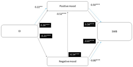 These results showed that H4 is acceptable. EI predicts SWB mediated by mood (H5). Positive and negative moods mediate the relationship between EI and SWB in parents of gifted children, but negative mood does not mediate the relationship between EI and SWB in parents of unidentified children (H6).