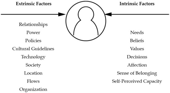 Concerning the intrinsic factors, these are determined and molded by the extrinsic factors; however, what and how an actor decides to act is ultimately an autonomous decision. The located intrinsic factors are the Needs, which could refer to an individual’s physical, physiological, emotional, and spiritual requirements to perform any activity within a transition. The Beliefs are related to the moral, ethical, and social constructs that affect individuals’ actions. Values refer to what an individual considers to be essential and beneficial. The Decisions guided by the other intrinsic factors are considered here because the extrinsic factors might ultimately affect how these decisions are expressed. Affection refers to whom an individual actor cares for in an existing transition network. The Sense of Belonging refers to the perception of being part of a group due to similar values, norms, and beliefs. The Self-Perceived capacity refers to the perception that the actors have to act upon transitions.