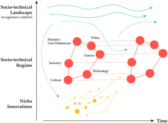 The leading scholars in this field are united in the Sustainability Transition Research Network (STRN) [15]. Their approach towards sustainable transitions considers socio-technical systems’ changes to be inherently multi-dimensional, highly complex, highly uncertain, open-ended, inherently normative, multi-actor, and co-evolving processes with long-term time-frames [3,16,17]. Recognizing these characteristics is essential to take a systemic perspective that allows new radical shifts in current socio-technical systems and understand the more sustainable ones [3]. One of the most referred frameworks to analyze those characteristics is the Multi-Level Perspective (MLP) by Geels [18]. It is a conceptual model explaining an analytical and heuristic concept to understand better the complex dynamics in sustainable transitions [18,19,20]. The model distinguishes three dimensions of sustainable transition: niche innovations, socio-technical regime, and socio-technical landscape [19]. In the model, niches are considered as incubation rooms filled with radical novelties nested in the regime. The regime is referred to as the rules that enable and constrain activities within communities, and the landscape constitutes out of deeply structured trends in which a technological trajectory is taking place [16]. These levels are, in turn, interconnected and interdependent.