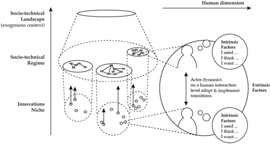 To allow the emergence of meanings within a transition, taking a human-centeredness stand can help to elicit intrinsic factors such as values and latent needs of individuals [86,87], and then help in the process of meaning-making. These factors inform about the different perspectives that individuals bring to a process of a sustainable transition. By acknowledging the intrinsic factors, it might be also possible to understand how the extrinsic factors are affecting the dynamics within a transition. Since human-centeredness focuses on the individual conditions of humans, and the already existing dimensions of niche, regime, and landscape provide information with regard to the extrinsic factors, the intrinsic factors will be the focus to analyze transitions.