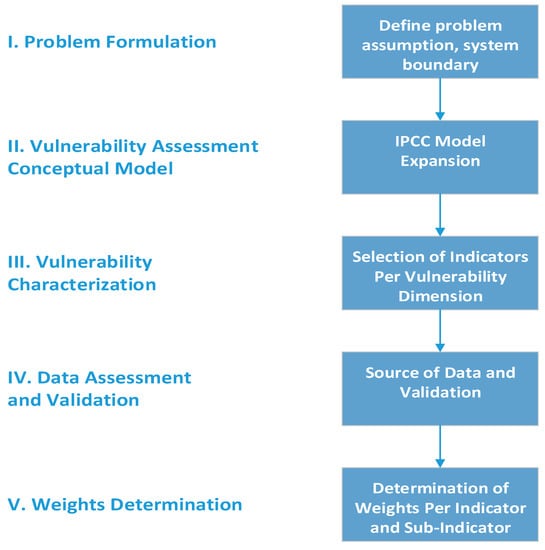 A five-phase research methodology was performed for vulnerability assessment in the Philippines, as shown in Figure 1. Phase 1 starts with problem definition and identification of the system boundary. Phase 2 is the expansion of the adopted Intergovernmental Panel on Climate Change (IPCC) Model [24] that defines vulnerability as a function of exposure, sensitivity, and resiliency. The expansion includes the three levels of assessment in the conceptual model for vulnerability assessment. In Phase 3, the different indicators including the sub-indicators per vulnerability dimension were identified. In Phase 4, the source data were identified, and the availability of the data for the indicators and sub-indicators were validated. Phase 5 focused on the process, such as consultative fora and workshops, to assess additional data and determine the weights distribution for the vulnerability indicators and sub-indicators. The subsequent sections explore the details of the five-phases of the vulnerability assessment.