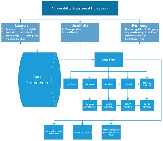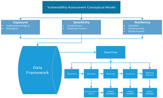The IPCC model was expanded based on the results of activities elaborated in Section 2.2. This incorporates the three vulnerability dimensions (i.e., exposure, sensitivity, and resiliency) and the need for the inclusion of a data framework and data flow through different levels of local geopolitical units as it reaches the national agencies, as illustrated in Figure 4. It was also cited in the work of Fussel [9] that the IPCC model lacks the integration of a sphere or the scale of assessment. The sphere refers to the internal or external geographical boundaries or the power to influence, which in this case are the three levels of geopolitical units. These geopolitical units follow the political structure of the local government, starting at the village-level barangays, then followed by the cities or municipalities, and finally the provincial level. The expanded vulnerability assessment model follows the three levels of geopolitical units as seen in Figure 4, which represent the scale of vulnerability assessment starting at the household level.