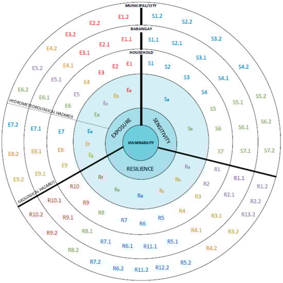 The identification of different indicators, shown in Figure 5, for each vulnerability dimension has provided the foundation for the development of VAF. These indicators were used to generate measurable variables that can aid in the assessment of vulnerabilities at three geopolitical levels such as household, barangay, and municipal.