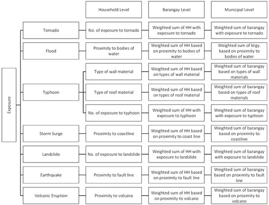 The exposure indicators at the municipal level were determined using the weighted sum of the barangay. A similar process to the barangay level was carried out for the municipal level, should one aspire to determine the vulnerability of the municipality. The details of exposure indicators at three levels are illustrated in Figure 7. This is an aggregation of exposure indicators to multiple hazards at several levels of geopolitical units.