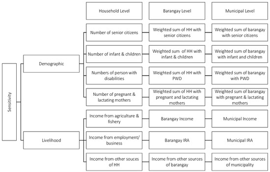 The overall sensitivity indicators at household, barangay, and municipal levels are summarized and illustrated in Figure 8. These are composed of seven indicators each for household, barangay, and municipal levels. The seven household indicators to sensitivity for seven hazards are categorized into two (a) the demography that is composed of the number of senior citizens, infants and children, people with disability, pregnant and lactating mothers; and (b) livelihood composed of the income from agriculture and fishery, employment/business, and other sources such as donation/support. The indicators under demography are calculated on its weighted sum for barangay level and aggregated to municipal level. The indicators under livelihood for barangay and municipal level are the barangay/municipal income, barangay/municipal internal revenue allotment (IRA), and barangay/municipal income from other sources.