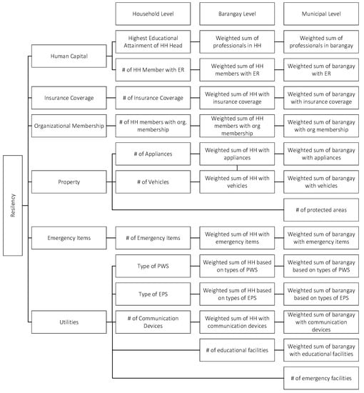 There are six primary indicators under the resiliency dimension with 10, 11, and 13 sub-indicators for household, barangay, and municipal levels, respectively, as shown as Figure 9. The six primary indicators for resiliency are human capital, insurance coverage, organization membership, property, emergency items/kits, and utilities. The sub-indicators under the household category are the highest educational attainment of the head of the family (which symbolizes the capability to make decisions), the type of potable water supply (PWS) and emergency power supply (EPS), the number of household members with emergency response skills, insurance coverage, membership to social/cooperative organizations, appliances, vehicles, emergency items, and communication devices. The indicators for barangay level are the number of educational facilities within the barangay area and the weighted sum of the aggregated information of the household level. The resiliency indicators at municipal level are the number of emergency facilities and protected areas and the weighted sum of the aggregated information of the barangay’s level of professionals, emergency responders and items, insurance coverage, membership to social/cooperative organization/s, appliances, vehicles, potable water supply, emergency power supply, communication devices, and educational facilities.