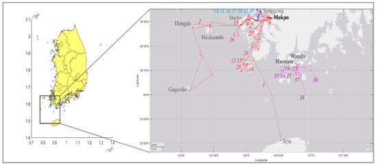 The analysis dataset includes 38 ferry routes, as shown in Figure 4; these include both general and subsidiary sea routes in the Mokpo area, for the year 2019. In general, a sea route is a route upon which a ferry operator operates under a business license for passenger carriage by sea; meanwhile, a subsidiary sea route is one in which the Ministry of Oceans and Fisheries orders a ferry operator to operate the ferry, to provide the necessary transportation for remote islanders; these routes receive compensation for the operational benefit losses caused by the operation. The dataset was assembled using the Statistical Yearbook of the Korean Shipping Association and the website of the Mokpo Regional Office of Oceans and Fisheries.