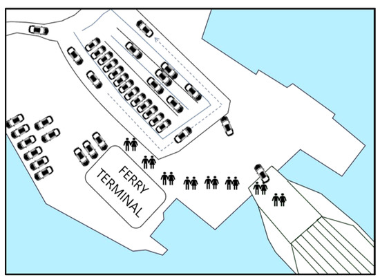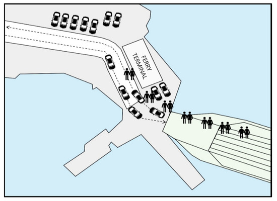 Generally, the ferry ships considered in this study have a deck for loading and transporting vehicles and passengers from the mainland to islands and between islands. These ferry ships can carry various types of cars on their rough-surface decks and passengers on the upper deck, which is referred to as a room for passengers to stay. The passengers aboard the ferry via its adjustable ramp, which acts as a wave guard and is lowered to a horizontal position at the terminal to connect with a permanent road segment that extends underwater; then, the passengers ascend the stairs leading to the upper deck. On long-distance routes, the ferry ship is designed as a cruise-ferry, combining the features of a cruise ship with those of a roll-on/roll-off ferry; thus, vehicles and passengers can board and disembark via separate routes. On short- and moderate-distance routes (which constitute a large part of the Korean ferry network), the ferry ship typically has an open-structured design, with only one way to board and disembark the ship; this path is shared between vehicles and passengers, as shown in Figure 1. Therefore, ferry ships on short- and moderate-distance routes present considerable dangers to passengers than long-distance ones.