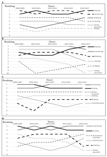 Time trend in preferences of physical activity (PA) practiced mostly outdoors by their ranking. (A) Czech girls (n = 6688), (B) Polish girls (n = 2826), (C) Czech boys (n = 4972), (D) Polish boys (n = 2546).