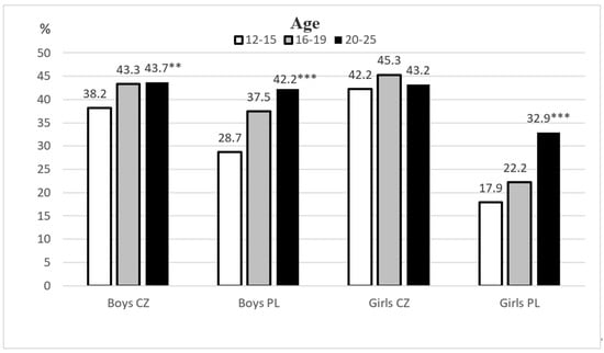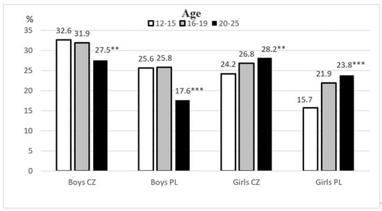 Preferred and concurrently practiced cycling activities among Czech boys and girls (CZ) and Polish boys and girls (PL) by age. A statistically significant difference was observed between 12–15-year-olds and 20–25-year-olds. ** p < 0.01, *** p < 0.001.