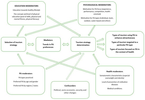 Trends in PA preferences predict the success of the selection of physical activity-oriented types of tourism and enable the application of evidence-based tourism strategies. However, many variables (in the form of moderators) interfere with the choice of tourism types based on PA preferences, which may significantly influence the effect of the tourism strategy selection. The simplified predictive model presents the main factors that affect the selection of physical activity-oriented tourism strategies (Figure 4).