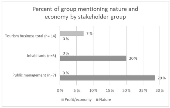 Environmental beliefs may be divided into three groups: an anthropocentric approach based on the instrumental value of the environment for human beings (humans above nature), a biospheric approach that values the environment for its own sake (natural balance), and an ego-bio-centric approach that values human beings within nature as a whole [,,]. Imran et al. [] investigated these beliefs, comparing different stakeholder groups, namely, protected area authorities, local communities, tourists and tourism enterprises. They found that the first two groups have a significantly higher eco-centric interest in the environment, but that there is a complex mix of ecological orientations among the stakeholders, depending again on a complex mix of contextual factors. Their results support Macnaghten et al. [] and O’Toole’s [] findings that context is important in understanding perceptions of sustainability. Furthermore, they found a tendency among all stakeholder groups to endorse pro-ecological values, but that these values were not of top priority.