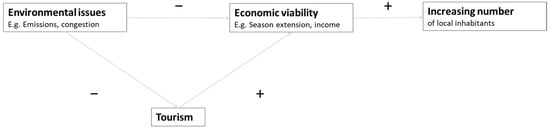 More broadly speaking, we have three main findings. Firstly, the interviewed stakeholders seem to be aware of the official definition of sustainability. When encouraged, stakeholders mention both social, environmental and economic aspects related to sustainability, and some refer to the balance between the three. The findings thus do not oppose the view that there is a form of consensus about what sustainability means in the public sphere [,,]. However, the priorities of local stakeholders do not include all three aspects of sustainability equally. Increasing the local population is of greater importance than the environmental and economic aspects. Also, the other main theme related to traffic is not predominantly an ecological issue. The emphasis of the stakeholders is on crowding, congestion and mobility of tourists and locals. Even with an environmental indicator like air pollution, stakeholders point out that air pollution is problematic, not so much for environmental reasons, as for the impact it has on the experience of tourists and thereby the image of the Geiranger area as a tourist destination. The perceptions of sustainability locally thus seem to reflect a hierarchy of values with main emphasis on social values, rather than a balance between the economy, nature and society (illustrated in Figure 5).