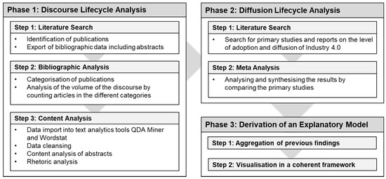 To avoid subjective bias, the coding process is independently conducted by two different researchers according to the interrater agreement concept (IRA). This concept enables us to justify the similarity in rating processes [45] and thus to enhance the objectivity and validity of the cluster analysis. Finally, the results of this cluster analysis are synthesized and interpreted to describe the discourse lifecycle of Industry 4.0. To further examine the diffusion lifecycle of Industry 4.0, we search for primary studies on the level of adoption and diffusion of Industry 4.0. Overall, two studies have been identified as relevant for the meta-analysis and synthesis step. The results of the diffusion lifecycle analysis enable us to draw a picture concerning the development of Industry 4.0 as a management fashion.