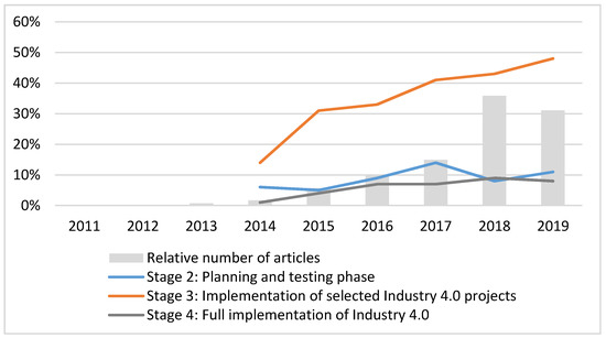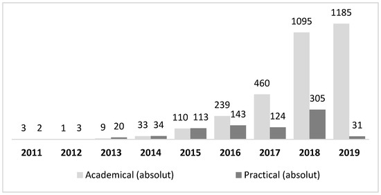 Consistent with Baskerville and Myers’ [14] findings, research and practice in the Industry 4.0 field exhibited a parallel bell-shaped pattern, whereby practitioners’ interest in Industry 4.0 topics was indeed higher in the beginning of the discourse (2011–2015) than the interest of academics. From 2016 to 2018, the number of academic publications sharply increased compared to the number of practical publications. Although the practitioners’ attention to Industry 4.0 significantly declined in 2019, the number of new academic publications steadily grew from year to year. This observation is consistent with Baskerville and Myers’ [14] findings, who state that research tends to appear slightly later when practitioner interest has already declined. By 2019, however, the growth in academic publications significantly decreased compared to previous years, which could be an indicator of the diminishing public interest in Industry 4.0. Another explanation for the practitioners’ reduced interest might be found in the simple fact that some publications such as news and newspaper articles that appeared in 2019 had not been indexed in the literature databases to date.