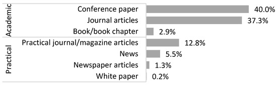 As depicted in Figure 3, popular outlets for the publications are academic publications such as conference papers and journal articles, which account for more than two-thirds of the entire literature sample, followed by practical publication outlets such as practical journal articles and magazine articles, news and newspaper articles. Overall, the results of the bibliographic analysis reveal that Industry 4.0 is at the peak of a discourse lifecycle of management fashions, with the typical observation of a rapid upswing within three to five years, as stated by Baskerville and Myers [14]. The beginning of the bell-shaped process is preceded by a resting phase [17] After the initially restrained years, a rising tendency can be seen in the academic course.
