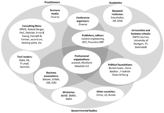 Since the Industry 4.0 concept was first introduced by the German government in 2011, in the beginning the debate was shaped by political actors with the main aim to promote its benefits and thus support its diffusion [46]. With a few minor exceptions, the Industry 4.0 debate has primarily taken place within the German political and practical circle until 2014. In their role as intermediates between the practical, academic and political circle, German professional organizations such as acatech or Plattform Industrie 4.0, business associations such as BITKOM, VDMA or VDI and political foundations have been involved in the public discourse of Industry 4.0 in different ways to provide strategic considerations and recommended actions for the German government [2,47].