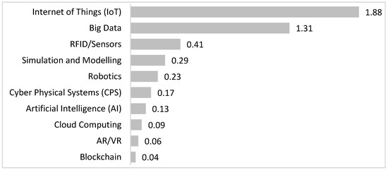 Figure 5 illustrates the 10 most frequently mentioned Industry 4.0 technologies and concepts, namely the Internet of Things (IoT), big data, RFID and sensors, simulation and modelling, robotics and cyber-physical systems (CPS). Other enablers of Industry 4.0 include cloud computing as one basic technology, artificial intelligence (AI), augmented and virtual reality (AR/VR) and blockchain technology. The dominance of the big data concept within the fashion discourse is not surprising, considering the fact that the use of RFID and sensors in CPS or IoT environments would logically generate a vast amount of data that require advanced techniques for their storage, processing and analysis [60,61,62].