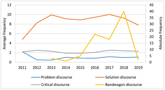 Figure 2 illustrates the absolute and relative distribution of each publication type over time from 2011 to 2019. The results of the bibliographic analysis indicate that the discourse begins in 2011 and significantly rises from 2014 onwards.