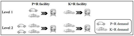 At the same time, from the current status of P + R construction, it can be seen that the service capability provided by P + R facilities in diverse locations are different. With the change of locations, the needs of K + R are also different. Therefore, in order to make the collaborative layout decision more detailed, this research divides the above two types of facilities into two levels (Figure 1). According to the passenger flow survey data and the existing P + R facility plan and after getting the opinions and suggestions of the decision makers and planners from the municipality, different facility service capabilities were set for each level. The specific classification methods and level thresholds are shown in Table 1.