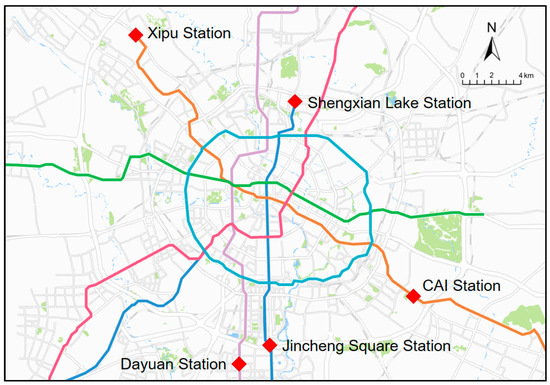 Chengdu is a densely populated city with a complete rail transit network. However, due to the large daily traffic volume in the central city and huge travel demand of residents outside the city, Chengdu is promoting the construction of car occupant transfer facilities. The currently completed P + R facilities are located at Jincheng Square Station, Shengxian Lake Station, Xipu Station, Chengdu Administration Institute Station, and Dayuan Station (Figure 2).