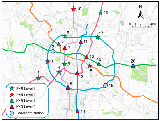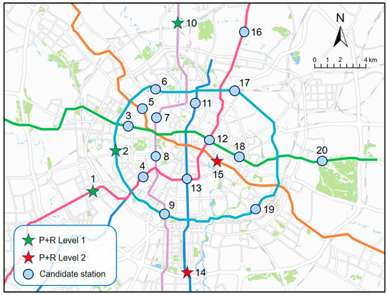 According to Liu’s preliminary selection model of car occupant transfer facilities based on spatial analysis theory [31], combined with the actual situation of Chengdu metro network, a comprehensive evaluation model was solved. As a result, 20 stations were preliminarily determined as the candidates for the proposed multi-objective optimization model. Their locations are shown in Figure 3.