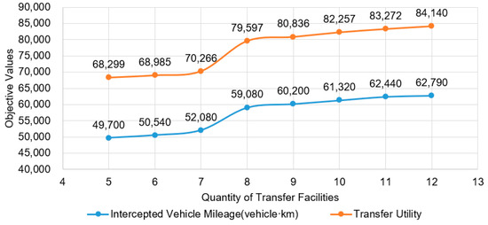In order to analyze the influence of the quantity of facilities on the optimization results, this section calculates the optimization effects under different quantities of facilities and summarizes the law of change. The specific steps were as follows: setting the K + R facility’s quantity constraint value to 0, adjusting the P + R facility’s quantity limit, running the model repeatedly, and recording the result. In this research, the optimization effect values with the P + R facility’s quantity of 5 to 12 were calculated, respectively. The results are drawn in Figure 5.