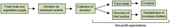 Food is lost or wasted at any level of the food supply chain, from primary agricultural production to household consumption [1,8,9]. Moreover, FLW occurs in all food categories [1]. Strategies to manage FLW should therefore involve public and private actors throughout the supply chain to diminish the environmental, economic, and social impacts [6,10]. Indeed, several countries have adopted public policies to manage FLW [6,11]. But the development of green business models faces the challenge of delivering and capturing values within the triple bottom-line (i.e., environmental, economic, and social results) to reach economically sustainable goals [12,13]. In this context, social enterprises should solve contradictory pressures associated with sustainable practices; for example, reduction of CO2 emission, efficiency in resource use, and mitigation of food waste [14].