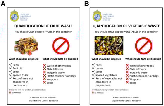 In HS+DON, the measurement began on Saturday, which corresponded to the day of reception of donation. In HS, the measurement began on Monday, which corresponded to the day of fruit and vegetable purchase. During these days, the homeless shelters are thus supplied with fruits and vegetables, and kitchen staff clean and arrange the pantry and refrigerators. Two plastic containers were delivered to each homeless shelter to collect waste; one container to dispose fruit waste and the other to dispose vegetable waste. All research procedures were explained to the kitchen personnel the day when plastic containers were delivered. Briefly, written informed consent was read, emphasizing that food waste is commonly produced at kitchens (to minimize desirability bias). Infographics about what should and should not be disposed into the containers were also explained and displayed in each kitchen (Figure 2). Note that plate leftovers were not considered in the measurement.