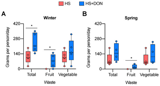 Total, fruit, and vegetable waste produced by homeless shelters in (A) winter and (B) spring. Boxes represent the 25th and 75th percentiles, with a horizontal line denoting the median; whiskers denote the minimum and maximum values. * p-value < 0.05 between groups. HS, homeless shelters that did not receive donation; HS+DON, homeless shelters that received donation.
