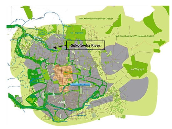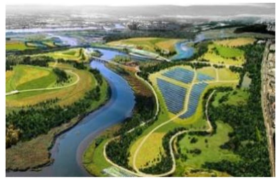 In the same trend, is the project to transform the city of Lodz [38] into a Water Sensitive City [39]. Most of Lodz’s urban waterways were transformed into underground canals in the past; this, combined with the high sealing of the soils, has exposed the city to numerous floods during the recent violent storms having numerous the consequences for the soil and the water system. As part of the European program Sustainable Water Management Improves Tomorrows Cities Health (SWITCH), a strategy for adapting the city to water has been implemented, based on the principle of green and blue networks. Urban-scale initiatives have been planned to recover the waterways and revitalize the riparian areas, to create green spaces and corridors to collect and manage rainwater, to condition urban planning to the system of green and blue networks (Figure 21). Currently, in this context, there is a pilot project and an integrated approach to design led by a team, where all the actors involved in the management of water resources and ecosystem services are represented and have been carried out.