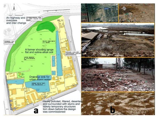 Kongjian Yu- Turenscape, Qiaoyuan Wetland Park. (a) Existing general masterplan, (b) the existing condition of the site: a former shooting range, shown as a garbage dump and drainage sink for urban storm water, heavy polluted with saline-alkali soil, littered, deserted and surrounded with slums and rickety temporary structures, Tianjin, 2005.