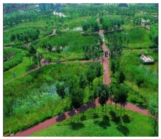 In an innovative way, the park is characterized by a micro topography through a naturalized landscape of ponds, which all vary in size and depth, where nature does all the work by collecting acid rainwater, neutralizing the alkaline soil, repairing the barren urban areas and finally reintroducing the structure of the native wetland that is predominant in the area. The main concepts of the QiaoYuan Park design are starting a natural process restoring the ecosystem and enabling the park to provide diversified ecosystem services to the city, realizing an ecological park with high performance and low maintenance costs [23]. Kongjian Yu uses basic elements derived from Tianjin’s regional natural and cultural landscape features (Figure 8). These components range from plant materials to industrial constituents, and realize different landscapes in different seasons, making the park a complete and rich landscape experience in different moments of the year. Seasonal changes in plant species occur and integrate, successfully balancing the constraints of the urban landscape and thousands of visitors to the park each year, while preserving the integrity of the delicate native vegetation and wetland habitat by using elevated platforms extended over the habitat. This is a successful example of a design approach to reestablish natural functions and let the dynamic processes of adaptation and succession occur. Key steps in the design process included: careful planning and plant selection, experimentation with species, monitoring of progress during the construction phase as plants became established, and adjusting the design accordingly to achieve the best performance.