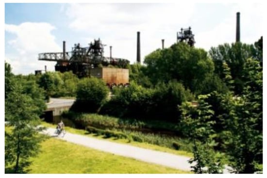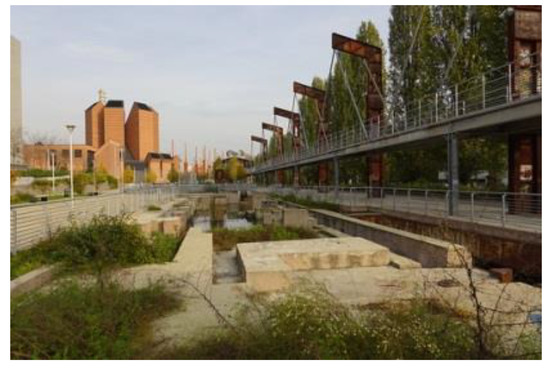 Peter Latz in the Dora Park in Turin reaffirms the aesthetic of the industrial ruins when transforming brownfields into a fluid open space system along and across the Dora River (Figure 14). “Our new conceptions […] is a metamorphosis of landscape without destroying existing features, an archetypal dialogue between the tame and the wild. Specific architecture for specific uses does not need to be built. The imagination lets the existing ones be re-interpreted and used in new ways. Artefacts can develop natural processes in derelict surroundings according to ecological rules started and maintained by technological processes. It is the idea of making time visible”, [26].