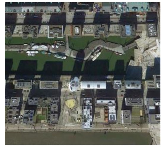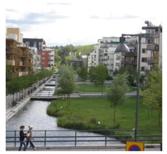 Noteworthy but in countertrend is the fact that vegetation has a very marginal or no role at all to play and therefore the relationship with water is essentially delegated to its mineral parts of the public space that protect and return excess water to the river. If HafenCity is well known, the Hammarby district in Stockholm is now a reference point for a sustainable city design. Designed in continuity with the pre-existing environmental system (woods and lake), the new district recovers the riparian areas, purifies the waters of the lake with phyto-depuration systems and builds a network of canals and green corridors for rainwater that crosses private and public spaces of the neighborhood and connects both the woods and lake ecosystems (Figure 20).