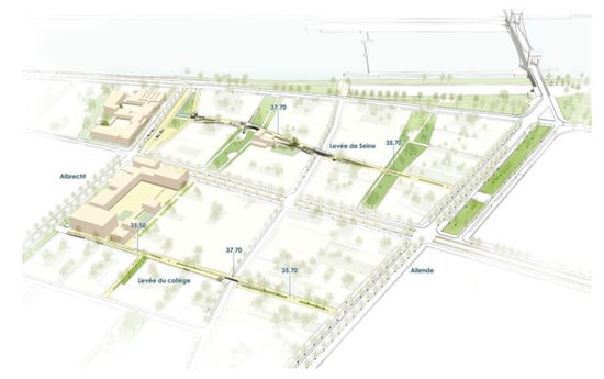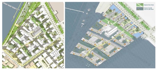The urban project for Vitry gare de Seine by Germe & Jam in France along the Seine is more radical in building a water-resilient environment. It has as reference the Flood of One Hundred Years and the issue of flooding risk is at the center of the design of the public space and the urban fabric. (Figure 22 and Figure 23). In Vitry, an artificial floor consisting of a network of elevated paths connected by walkways allows the connection of urban services and the entrances of residential buildings in the event of an extraordinary flood, while public spaces are designed to adjust to ordinary floods and violent rains.