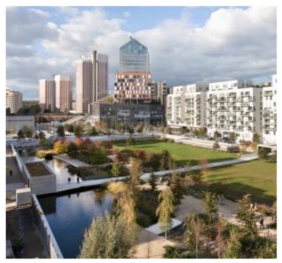 There are also very innovative interventions in the domain of the rainwater management; previously considered as something to be disposed of, today rainwater is transformed into a resource, both in “normal” and in exceptional conditions. A resource to be retained and organized by capitalizing upon it, and then to be used in irrigation, in mitigating the effects of climate change, and in the treatment of urban heat islands [40]. The number of innovative projects is increasing and the majority are oriented towards using the urban soil surface for the temporary collection of water. The water collected, when possible, is transformed into a temporary leisure resource and, at the same time, providing a careful filtering capacity and a permeability of the soils, can be used for watering or slowly released into nature. There are two types of projects: places with a prevalence of plants, parks or natural areas integrated into the urban fabrics which, in the soil and vegetation arrangement and in its design and use, integrate temporarily humid landscapes, and small-sized mineral places, squares, capable of holding rainwater, integrating the overflow with the creation of accessible pools and fountains. In the first group are the Urbanwater Parc des Docks in Saint Ouen, the Agence Ter’s Parc Trapeze in Boulogne Billancourt, and the landscape project for the new Rives de la Haute Deûle district of the atelier de paysage Bruel Delmar.