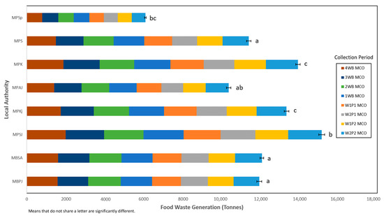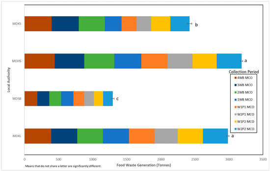 The published results are expressed as mean ± standard deviation (SD) of triplicates. Relative change (%) was used in descriptive statistics to analyze total food waste generation against the collection period in Selangor [10]. One-way ANOVA was performed to determine the effect of MCO on food waste generation in municipal and district areas. ANOVA test employed Tukey’s post hoc analysis. Student’s t-test was used to compare food waste generation against local authorities. All statistical analyses were conducted with SPSS software (v.12, IBM, SPSS, New York, USA) at a significance level of 0.05. Difference in means is marked with a letter in figures.
