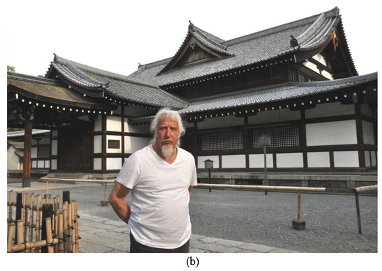 (a) Demonstration in Japan, 2014. Old techniques of the Takeda-ryu school; (b) Dr. Roland Maroteaux in front of the Butokuden building. Kyoto, Japan 2009.