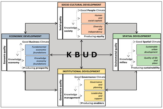 As mentioned above, KBUD is one of those contemporary terms that has been successfully applied for explaining the overall development of urban locations [17]. The model has gained popularity as it combines four main elements that are considered to be crucial (positive) to development trajectories and pathways [18]. The KBUD framework has become increasingly popular during the last two decades and was conceived in the mid-1990s [19] and has gone through a significant number of updates and detailing in contemporary literature. Because the advance of economies is being radically altered by dynamic processes of economic and territorial restructuring, supported by knowledge and innovation [20,21,22], the KBUD framework offers a potentially beneficial set of instruments (Figure 1), which can improve the well-being and competitiveness of cities [23,24].