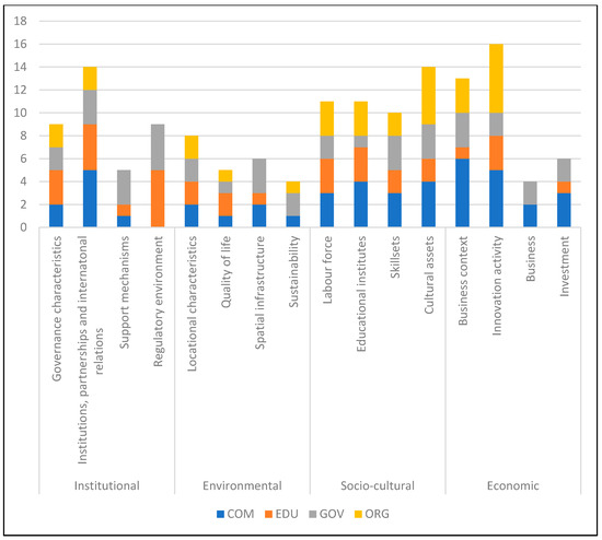 Last, but not least, economic development was the second most cited KBUD dimension among interviewees, with 39 mentions. Overall, the business environment, meaning the context of economic activities developed in the city, as well as its innovation practice, presented the major highlights (n = 29), whereas business infrastructure and investment had fewer mentions (n = 10), basically pointed out by the public and private sectors.