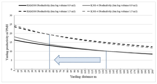 Further, we evaluated the impact of the cycle log volume on the performances of both machines (Figure 4). The productivity of each machine changed with yarding distances from 10 to 200 m under the following conditions: lateral distance of 10 m, cycle log volume between 0.9 and 1.5 m3 and one tree per cycle. Overall, the estimated productivity increased as the cycle log volume increased for both models. Even if the DCT was longer for yarding a large cycle log volume, the productivity increased for both machines because of the payload per turn. In addition, the HAM300 exhibited higher productivity values for yarding distances higher than 55 m.