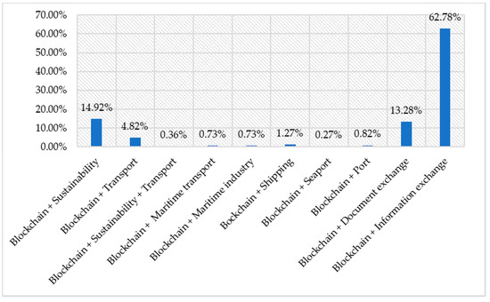 A search was performed in order to determine whether the publications contained at least one of the search terms in the title, abstract, or the entire manuscript (formal criteria). As shown in Figure 2, the highest number of hits was obtained by searching for the keyword “Blockchain AND Information exchange”. The lowest number of hits was obtained by searching for the keyword “Blockchain AND Seaport”, because seaports are in themselves a narrow topic.