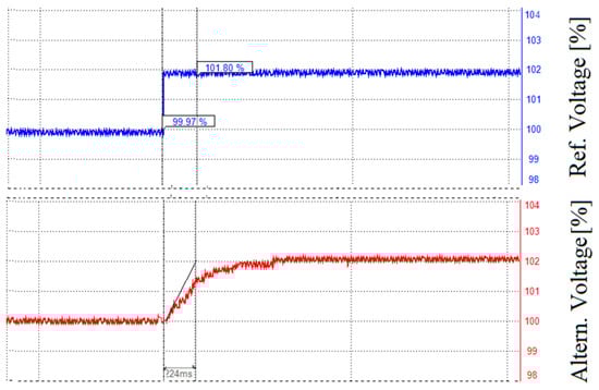 The acquired know-how gave the possibility to develop the RDT14© voltage governor. Unlike the RDF12©, the RDT14© governor consists of a control part called RDT14-CU and a power part called RDT14-PU. The control part has two pre-set operating dynamics, the first for the no-load operation of the alternator and the second for the operation of the alternator closed on the electrical network. The first dynamic is used to align the amplitude of the alternator voltage with that of the electrical network. For example, when a 2% of voltage step is imposed, the response time is T = 224 ms (Figure 5), where T is the first order time obtained from the intersection between the line at 102% voltage and the inclined line passing through the first steeper linear trend of the voltage increase. The second dynamic uses parameters calculated on the characteristics of the alternator to have a reactive and stable control system (Figure 6). The response time is 232 ms, although the governor cannot bring the alternator voltage to the increase of 2% tension because the machine switch is closed on the electrical network. The RDT14© governor has been installed in seven power plants owned by CVA; the biggest controlled hydroelectric group is in place in Valpelline (power 75 MVA), the smallest one is in Montjovet (power 28 MVA).