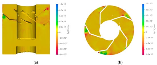In May 2018, CVA resolved a serious problem affecting the Kaplan turbine in operation at the Hone 1 power plant (Hone, Aosta Valley—Italy) [], related to an abnormal behavior during the load rejection from high power (>15 MW). The operating data that characterize the plant are gross head: 37.65 m; nominal flow rate: 55 m3/s; nominal power: 22.00 MVA (20 MW). For example, in the event of a trip in 1984, the behavior of the turbine was so abrupt to generate strong vibrations and the lifting of the turbine itself (Figure 2). To avoid this, the turbine has always been limited to operate at a power below 18.5 MW. To remedy the problem, the solution was to develop new closure laws of the distributor and the runner blade, based on numerical simulations (Figure 3). In particular, a bi-linear distributor closing law with a “knee” to better control the dynamic phenomena in the draft tube was used, in combination with a completely different procedure for the runner blades, which open instead of close. After several numerical tests, an optimized set of closing laws was found, and the real data measured in-situ are shown in Figure 4. The relevant diagrams, related to the 20 MW trip, indicated a far smoother dynamic behavior at the draft tube and a stronger reduction of rotor speed, which together avoided the lifting of t.