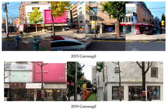 - Lee, I.; Bae, J. Transition of Building Uses in the Culture-based Vitalization of Commercial Streets—A Case Study of Garosu-Gil, Seoul. J. Urban Des. Inst. Korea Urban Des. 2013, 14, 127–140. [Google Scholar]